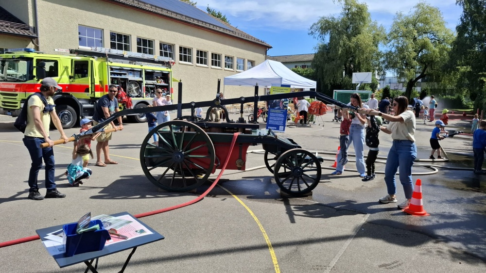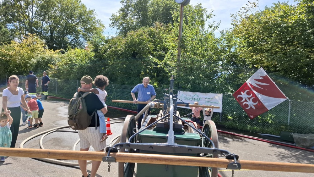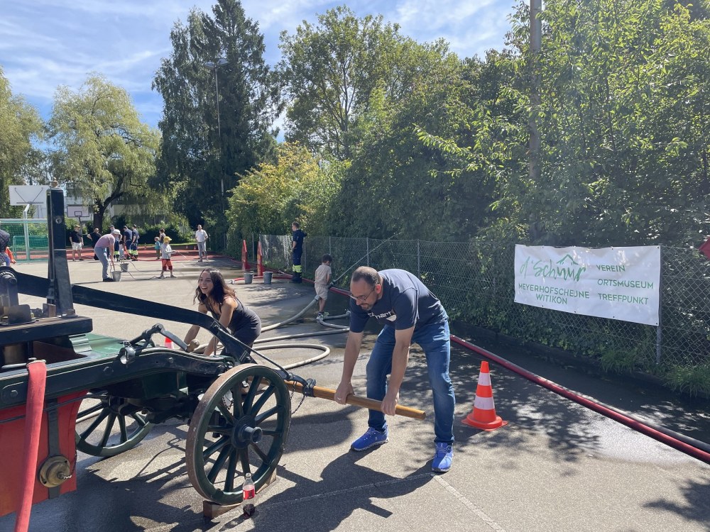 Feuerwehrspritze der Meyerhofscheune. Besonders die Kinder hatten viel Spass daran, Wasser zu pumpen und mit den Schläuchen