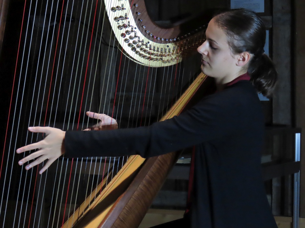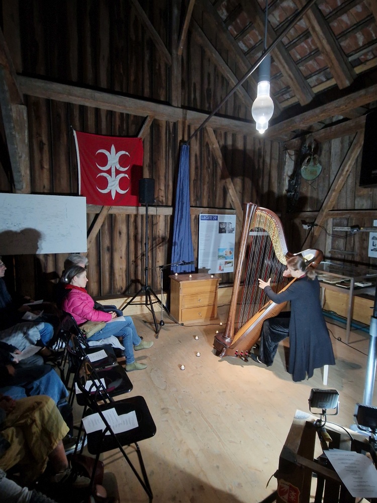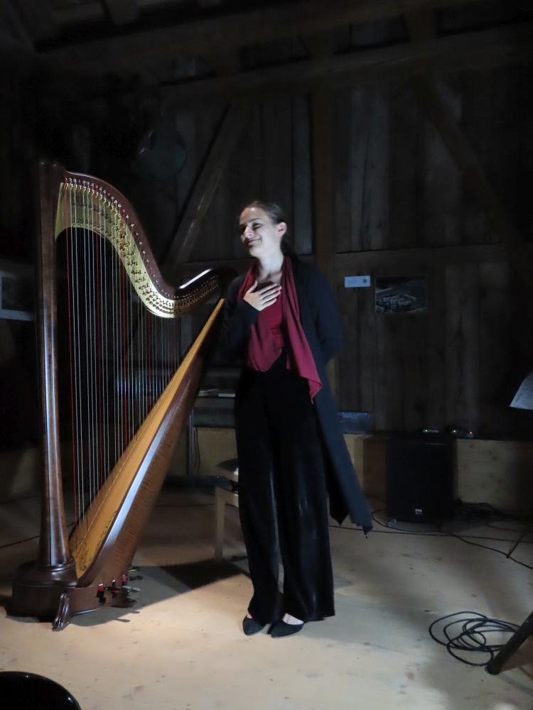 Zum zweiten Mal ist Alessandra Münger mit ihrer Harfe in der Meyerhofscheune aufgetreten. Sie hat das Publikum mit ihrem Programm "Zwischen Saiten und Zeiten" auf eine musikalische Zeitreise von Bach bis zur zeitgenössischen Musik mitgenommen.