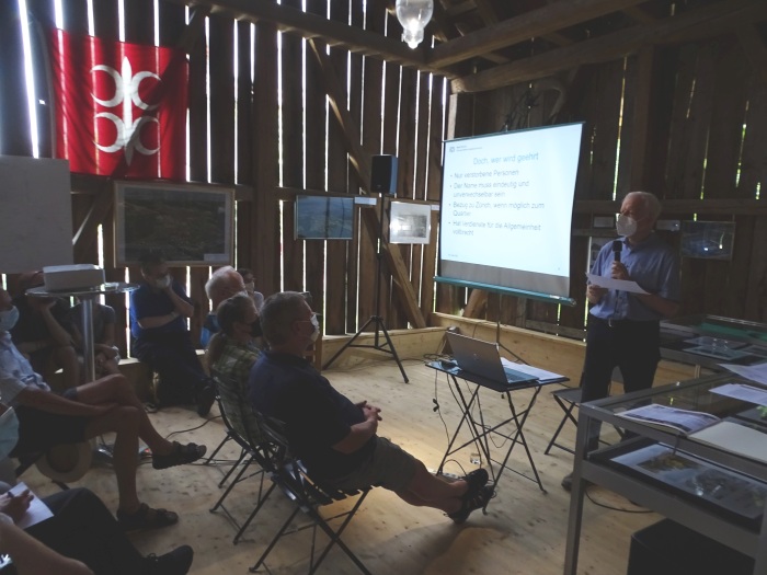 Der diesjährige Quartierrundgang startete in der Meyerhofscheune mit einem interessanten Vortrag von André Oprecht über die Benennung der Strassen in unserem Quartier. Herr Oprecht ist pensionierter Direktor von Geomatik & Vermessung der Stadt Zürich und war jahrelang Mitglied der Strassenbenennungskommission der Stadt.